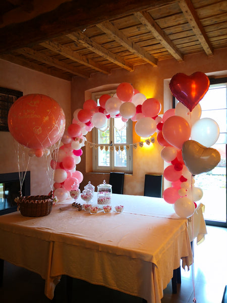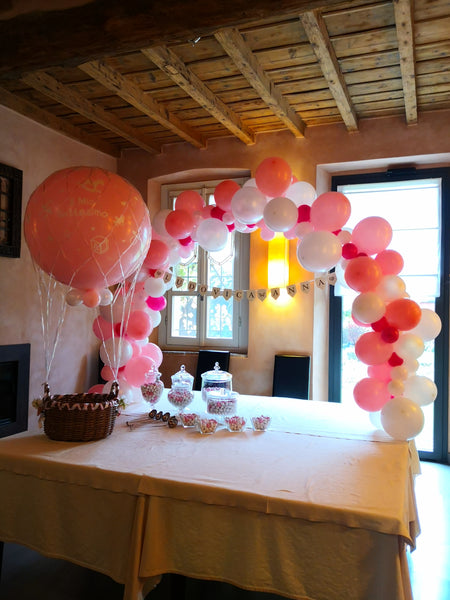 Allestimento personalizzabile con arco da tavolo, mongolfiera big elio e colonnina palloncini