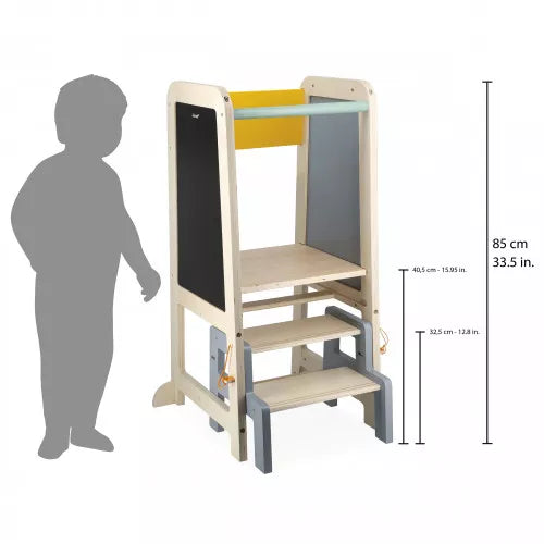Per diventare autonomi come i grandi! Questa torre di osservazione in legno, adatta ai bambini dai 18 mesi in su, è ideale per acquisire l'indipendenza e la sicurezza necessarie per esplorare il mondo. Un torre di apprendimento ergonomica e funzionale, dotata anche di una lavagna in ardesia accompagnata da 2 gessetti e 1 cancellino! Questa torre di osservazione multifunzione conquisterà tutta la famiglia. I più piccoli potranno sviluppare le abilità motorie, diventare sempre più autonomi e divertirsi a disegnare con questa torre di apprendimento in legno! Per seguire il bambino durante la crescita e fino ai 3 anni, questa torre di osservazione evolutiva è dotata di uno sgabello che si fissa ai lati della torre o può essere usato in modo indipendente. E per una maggiore adattabilità, questa torre di osservazione multiuso è variabile in altezza: sono disponibili 2 livelli (32,5 cm e 40,5 cm) facili da regolare! Lo spessore del legno rende questa torre di osservazione un giocattolo multisensoriale robusto e sicuro per i bambini. Grazie al suo stile classico e alle forme arrotondate, questa torre di apprendimento per bambini può essere installata in tutti i punti strategici della casa, come la cucina o il lavandino. Pratico e pedagogico, questo mobile evita la frustrazione dei più piccoli che non riescono a raggiungere il tavolo o il piano di lavoro, consentendo loro di partecipare alle attività quotidiane. La torre è perfetta per non sentirsi esclusi e stimolare la curiosità: i bambini potranno esplorare ciò che li circonda in totale sicurezza! Dopo essere salito sulla torre di apprendimento, il bambino avrà le mani libere... E anche i suoi genitori!
