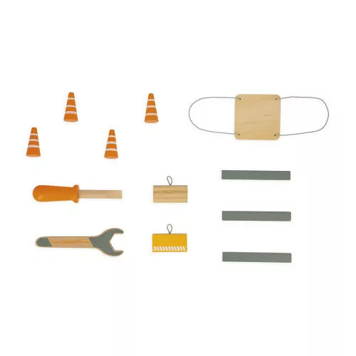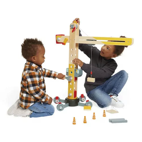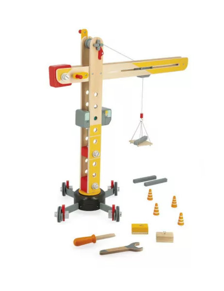 Attenzione, piccoli fan dei cantieri e dei lavori edili! Con questo giocattolo in legno a forma di gru potrete vestire i panni di un esperto capo cantiere e dirigere i lavori! Questo grande giocattolo alto 74 cm occuperà un posto di rilievo nelle avventure dei bambini dai 3 anni in su. Questa robusta macchina per lavori edili farà sognare tutti gli apprendisti costruttori. Per prima cosa è necessario assemblare il giocattolo: un primo gioco di costruzione che farà divertire i piccoli operai. Questa grande gru mobile poggia su 4 ruote che la rendono molto stabile. Inoltre, un sistema di bloccaggio impedisce alla macchina di muoversi, se desiderato. La gru è facile da manovrare grazie alle 2 manovelle situate sulla parte superiore. E come nelle vere gru, è possibile far salire e guidare una navicella che trasporta i materiali pesanti in tutto il cantiere! Questa magnifica gru in legno, dai toni naturali, arancioni e rossi, è dotata di 10 accessori e 2 utensili. È fabbricata in legno FSC® (proveniente da foreste gestite in modo sostenibile).